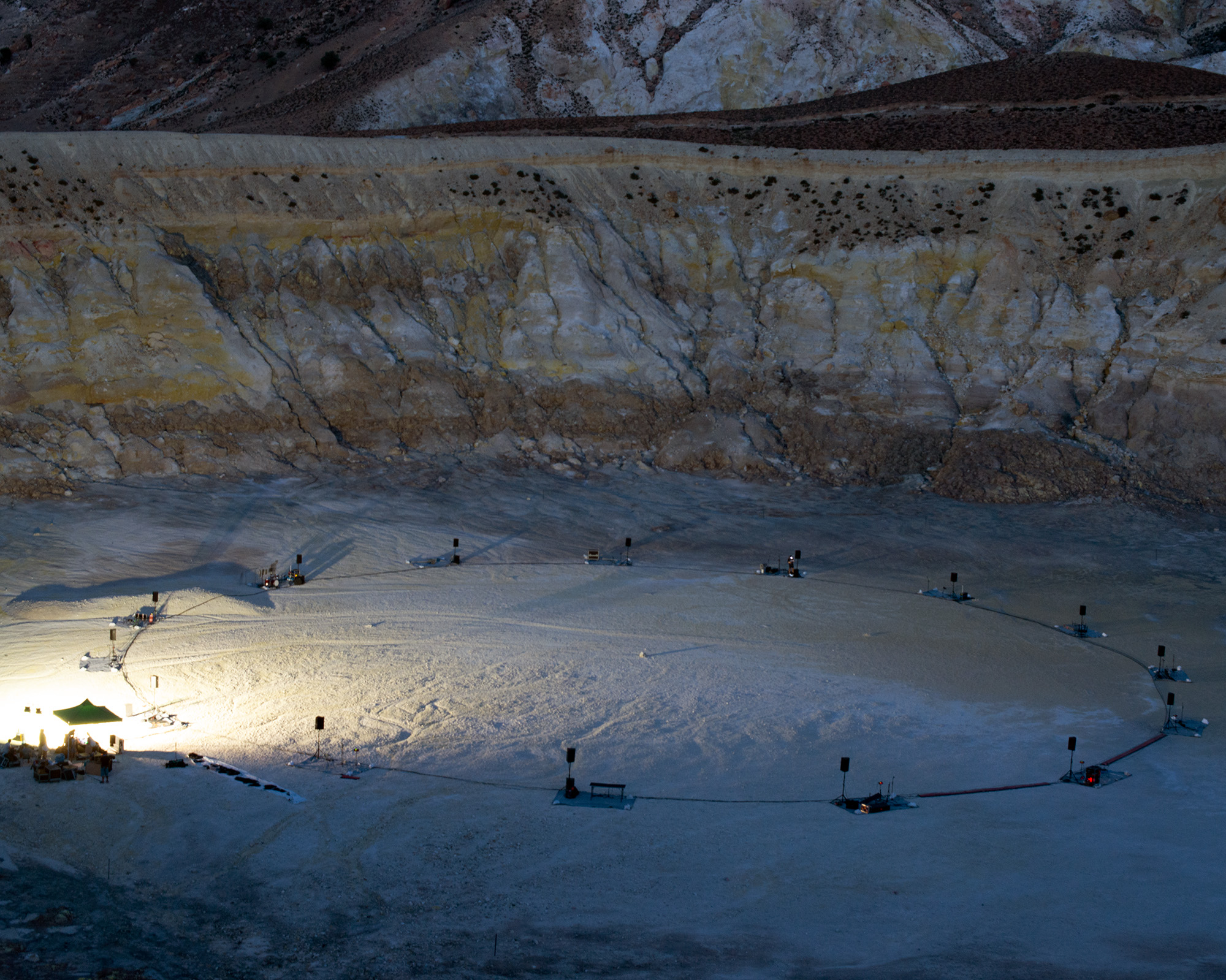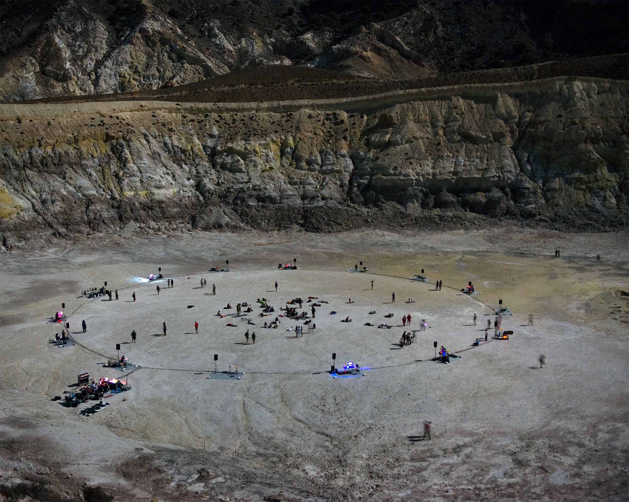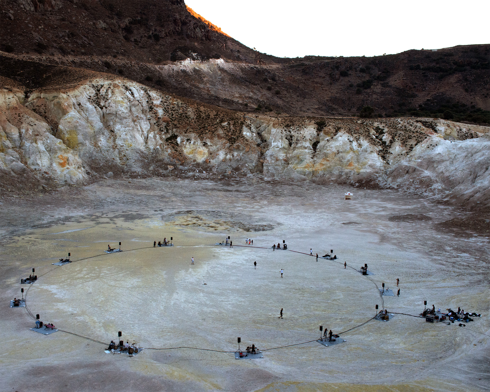 Situated at the core of this unique natural scenery, at the bottom of a huge volcano crater, 300 meters in diameter, at the remote island of Nisyros, 15 musicians engaged in an unprecedented experiment, creating a lengthy improvisational music piece that was composed on the fly. The event started at sunset on Thursday 18th of August at 19:58 and concluded 634 minutes later, at sunrise at 06:32 on the morning of Friday 19th of August...