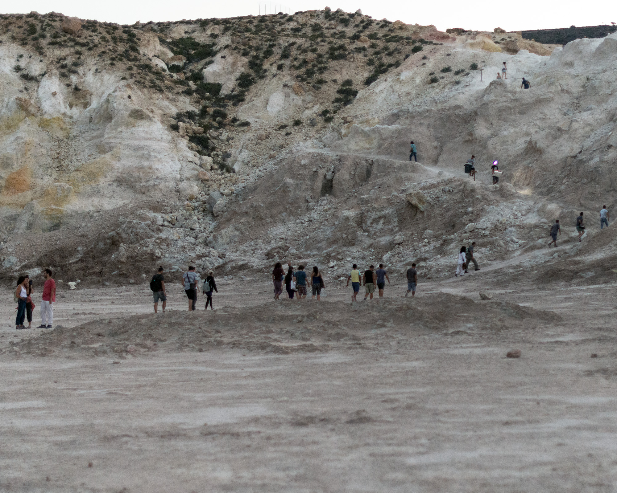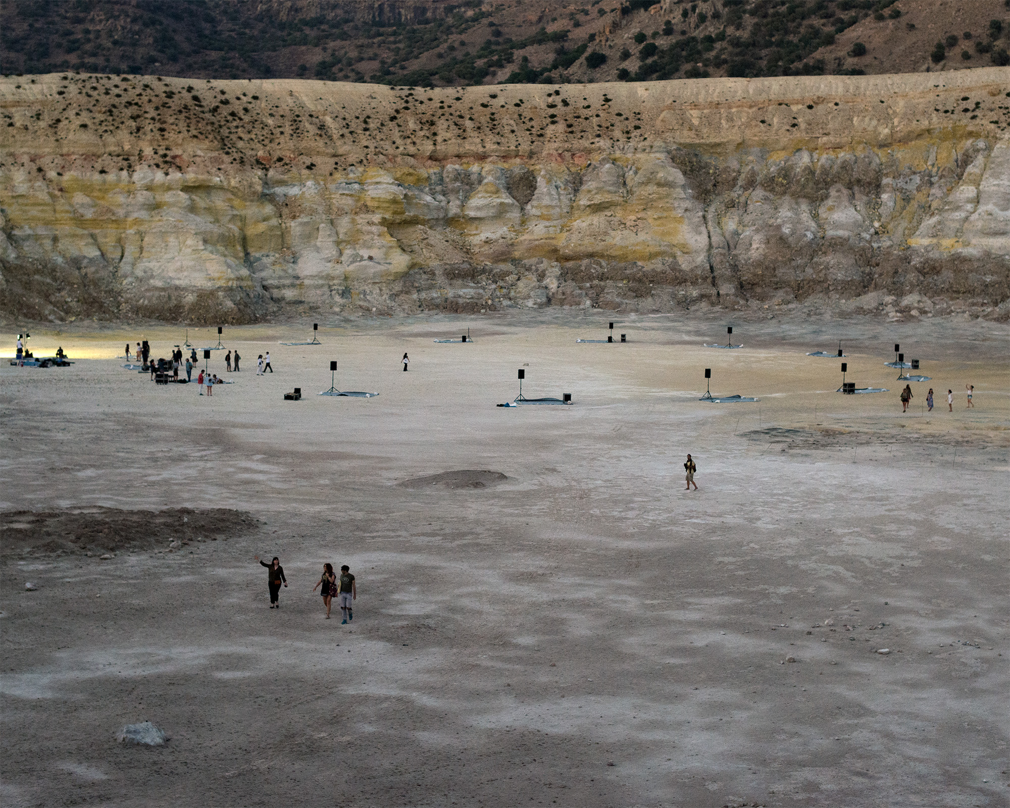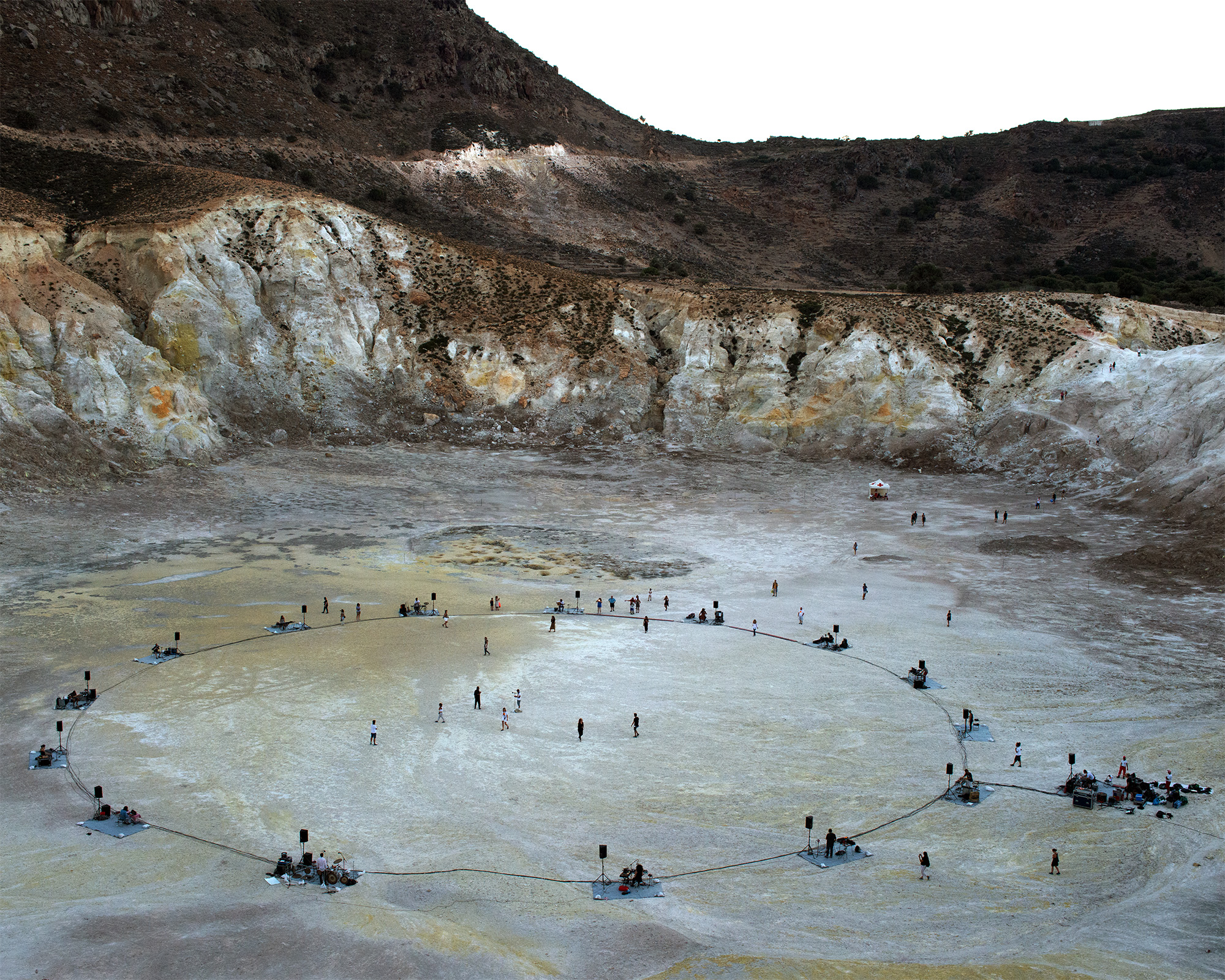 Situated at the core of this unique natural scenery, at the bottom of a huge volcano crater, 300 meters in diameter, at the remote island of Nisyros, 15 musicians engaged in an unprecedented experiment, creating a lengthy improvisational music piece that was composed on the fly. The event started at sunset on Thursday 18th of August at 19:58 and concluded 634 minutes later, at sunrise at 06:32 on the morning of Friday 19th of August...